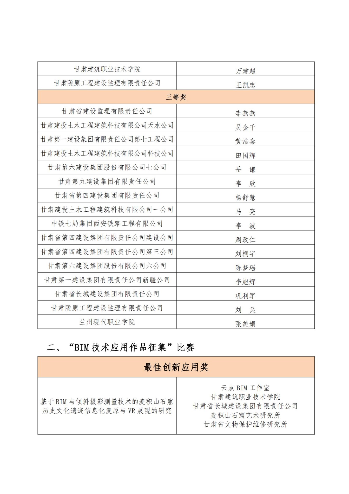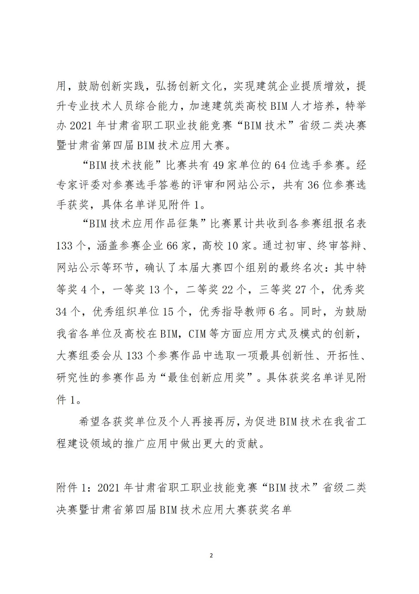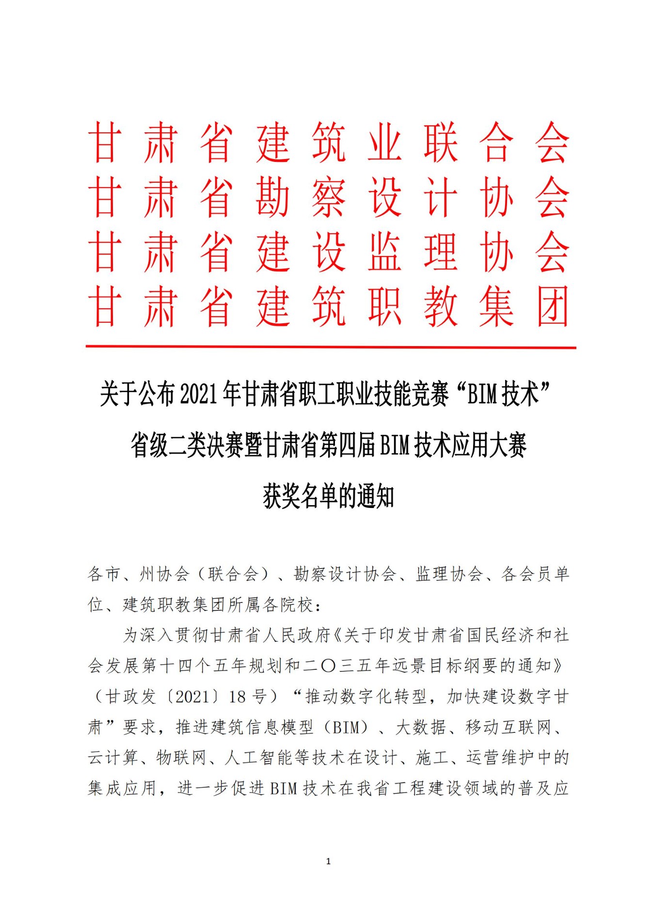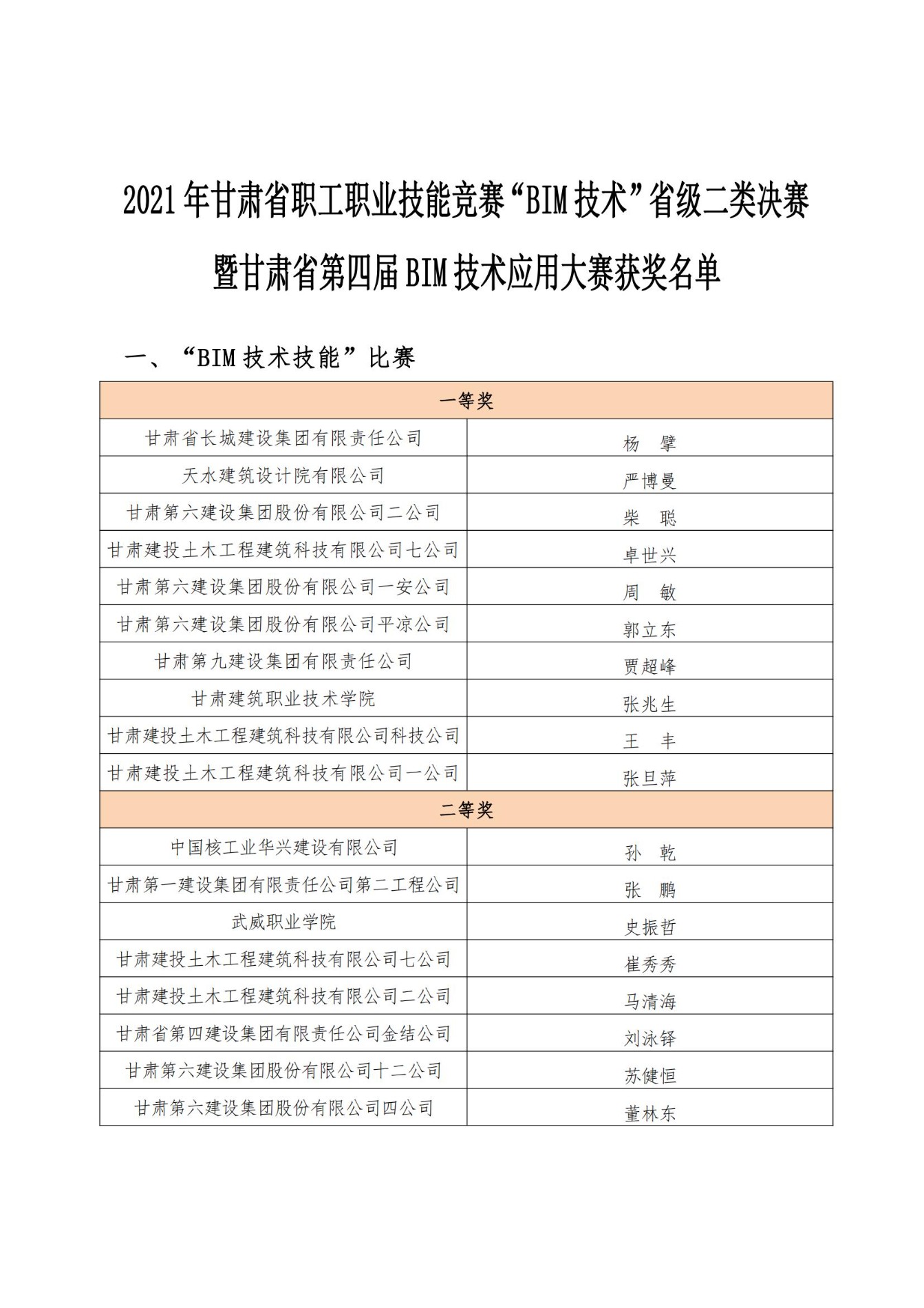关于公布 2021 年甘肃省职工职业技能竞赛“BIM 技术” 省级二类决赛暨甘肃省第四届 BIM 技术应用大赛 获奖名单的通知