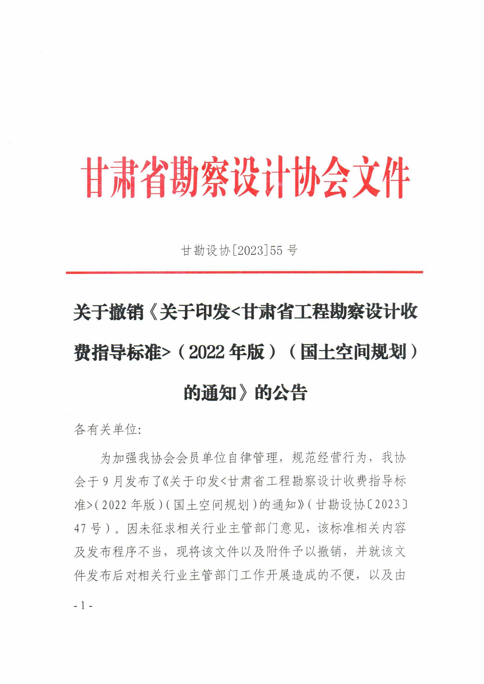关于撤销《关于印发<甘肃省工程勘察设计收费指导标准>(2022年版)(国土空间规划)的通知》的公告