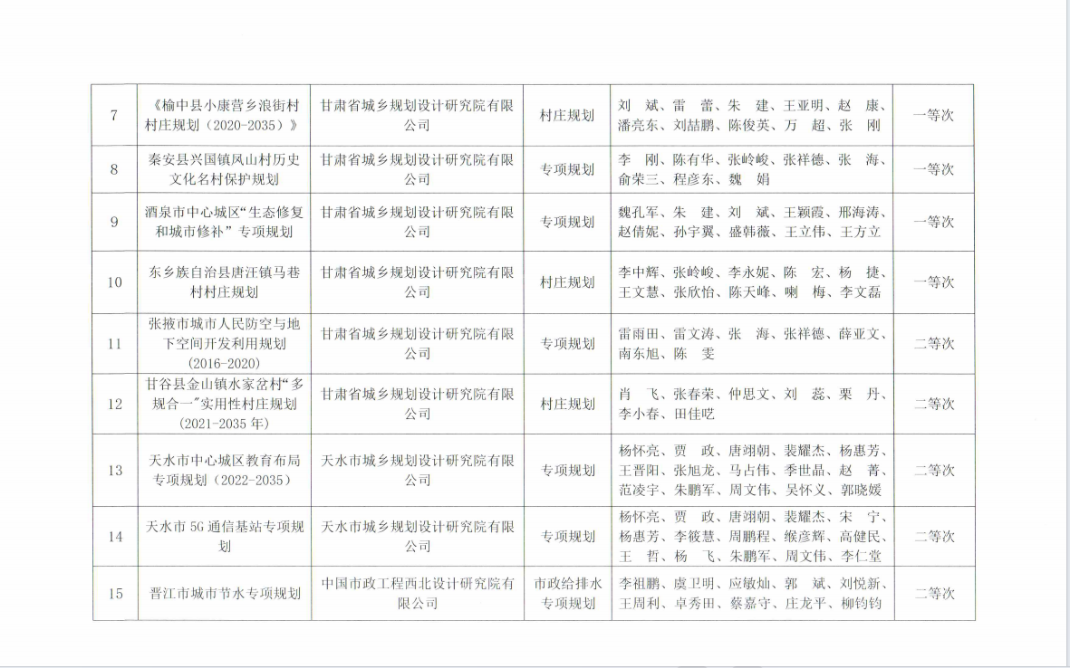 关于公布2023年度甘肃省城市规划设计成果等次评定结果的通知