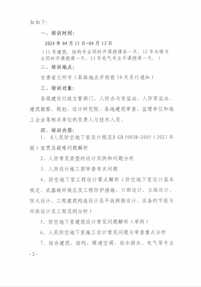 关于举办“2024年《人民防空地下室设计规范》GB50038-2005(局部修订版)培训班”的通知