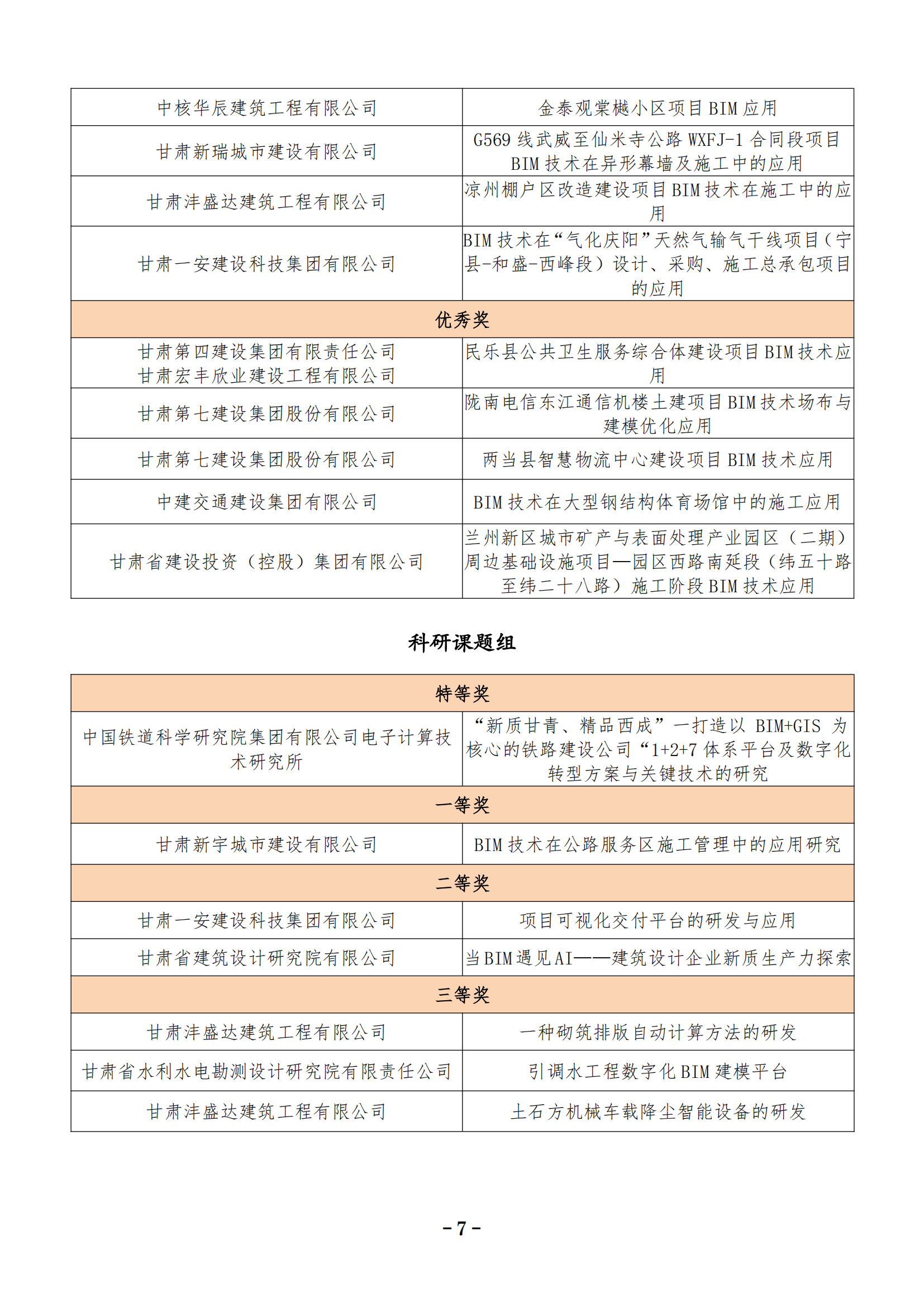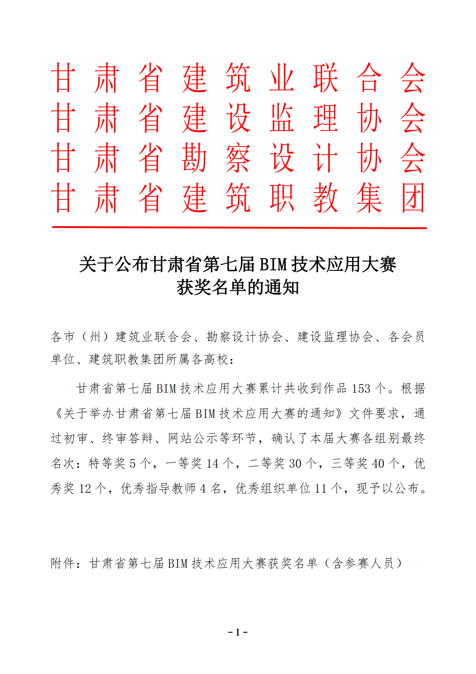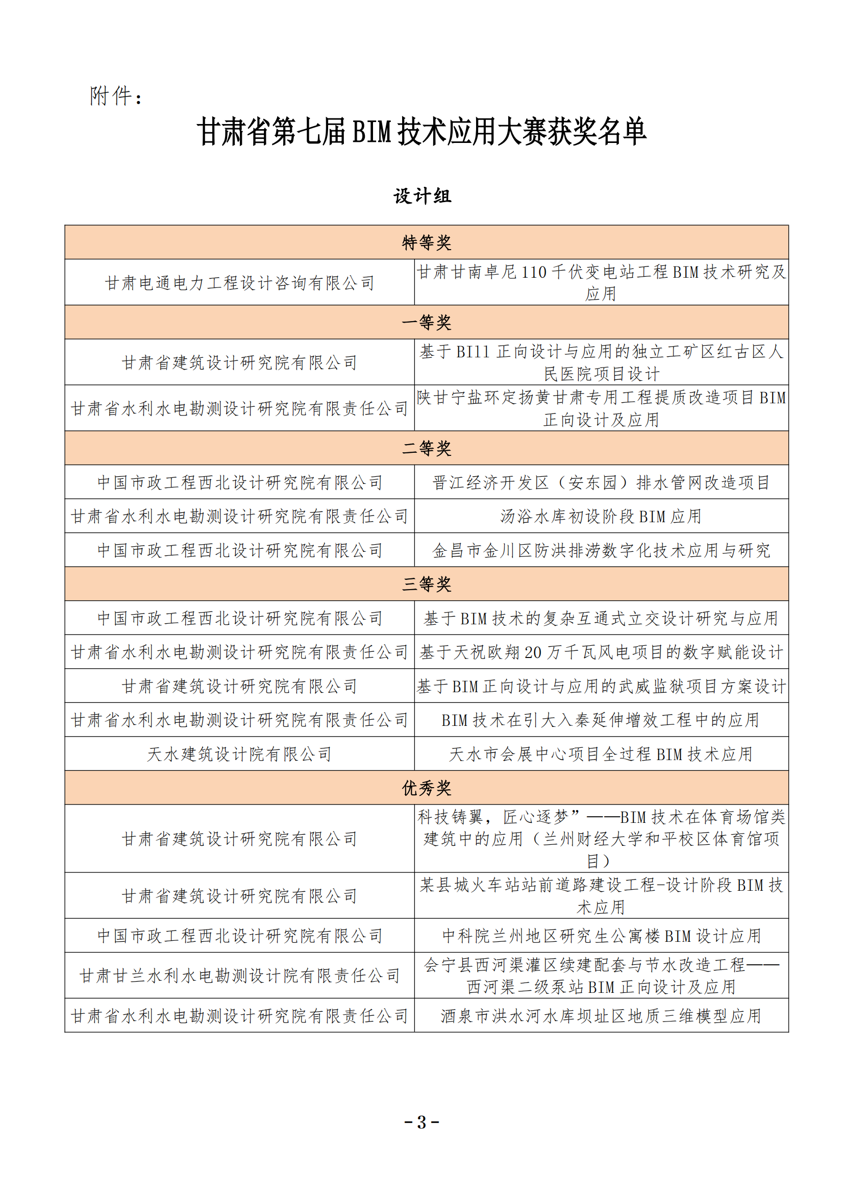 关于公布甘肃省第七届BIM技术应用大赛获奖名单的通知