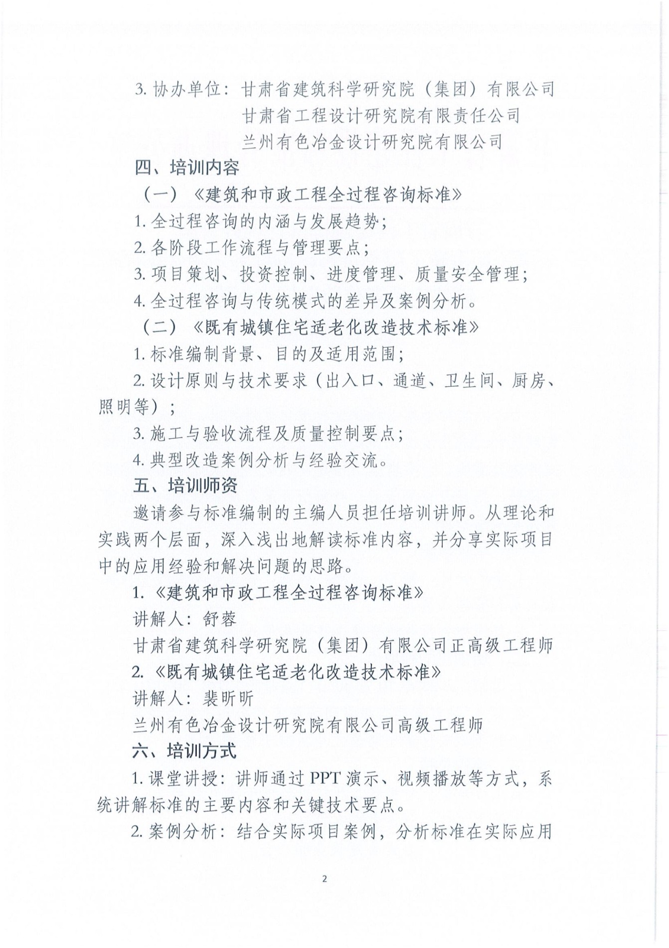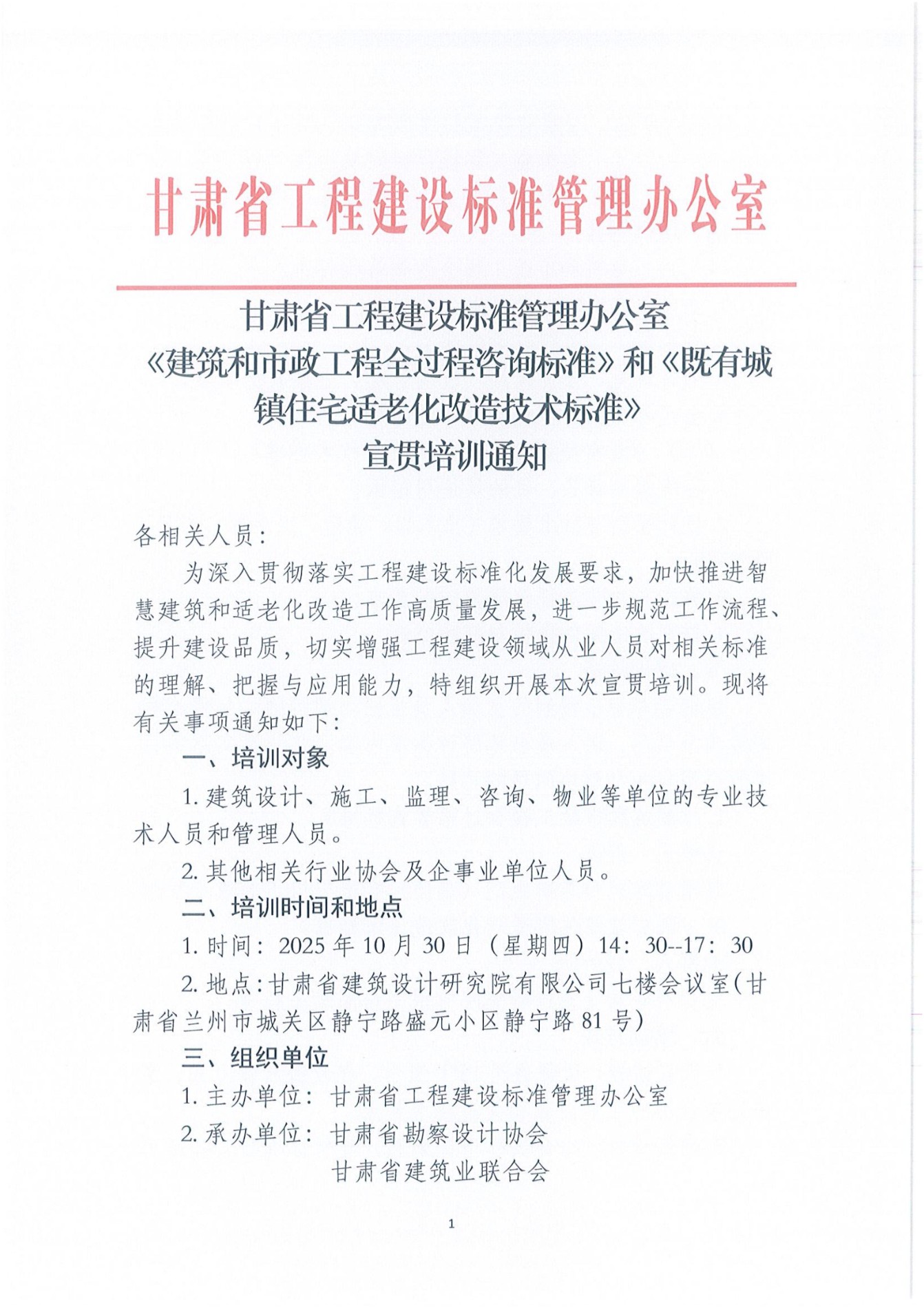 甘肃省工程建设标准管理办公室《建筑和市政工程全过程咨询标准》和《既有城镇住宅适老化改造技术标准》宣贯培训通知